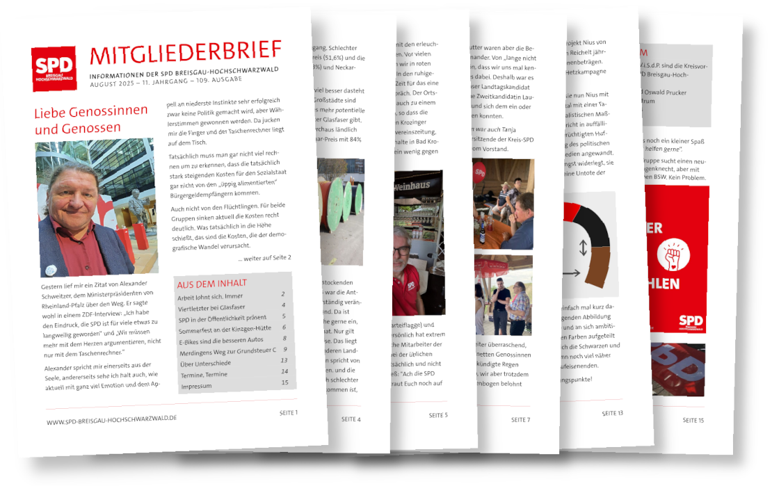 Unser Mitgliederbrief für den August bietet wieder einen bunten Themenstrauß von der derzeit bestimmt nicht erfreulichen Bundespolitik bis zu schönen Festen vor Ort und im Ortsverein.