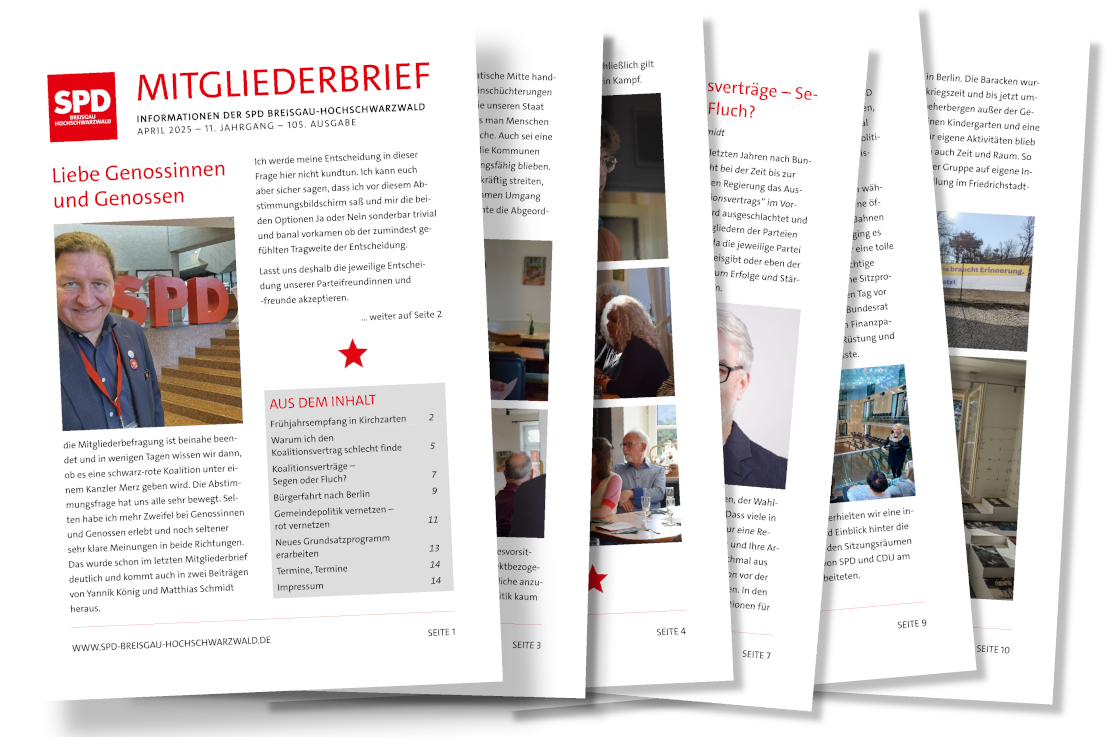 Der Brief kommt mit klaren Meinungen für und gegen den Mitgliederbrief, blickt aber auch auf unseren schönen Frühjahrsempfang in Kirchzarten zurück. Die Bad Krozinger berichten von ihrer Fahrt nach Berlin und Jenny, Helmut und Ossi wollen die sozialdemokratische Kommunalpolitik stärker vernetzen. Wir sind sehr gespannt, ob uns das gelingt.