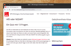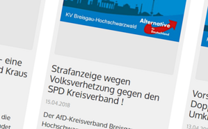 Wie wir mit monatelanger Verzögerung bemerkt haben, hat die AfD Breisgau-Hochschwarzwald unseren SPD-Kreisverband im April des letzten Jahres wegen Volksverhetzung angezeigt. Steht auf deren Homepage (verlinken wir nicht, fragen Sie die Suchmaschine ihres Vertrauens). Namentlich ging die Anzeige an die Vorsitzende Birte Könnecke und Stellvertreter Oswald Prucker.